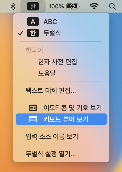 1. 메뉴 상태바에서 한영 표시 아이콘을 클릭하면 아래와 같이 메뉴가 나타나게 된다.